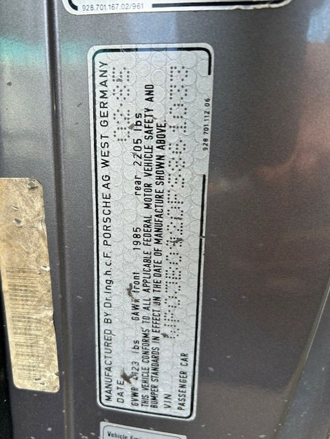 | VIN WP0JB0920FS861033 Model Code 928-910 Gearbox Type G2811 Engine Type M28/43 Tire Manufacturer Goodyear Engine Serial N/A Transmission 5-Speed Manual Country United States Country Code C02 Date of Production February 14, 1985 Invoice Date February 22, 1985 Trading Partner clas01 Commission Number 021466 Production Number 1252296 Assembly Factory Stuttgart Exterior Exterior Color Meteor Metallic/Meteor Metallic Exterior Paint Color Y5, Meteor Metallic Exterior Color Code Roof Color Y5, Meteor Metallic Interior Interior Trim Red Painted Seats-Red Accents Interior Trim YZ Interior Trim KL Carpet Color Code 8MD Seat Combination Number LG7 Seat Cushion Material LE Seat Side Support Material LE Seat Back Material LE Additional Equipment (8) Option Code Description 018 Steering Wheel with Raised Hub 158 Standard Radio 418 Protective Side Moldings 481 5-Speed Manual Transmission 490 HI-FI Sound Pkg w/Speakers 494 Amplifier System 533 Alarm System 650 Electric Sliding Sunroof |