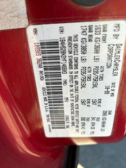 Y: Model Year 2000 B: DODGE 4: MULTIPURPOSE PASSENGER VEHICLE H: 6001 - 7000# (2722 - 3175 kg) GVWR & HYD BRAKES S: DURANGO (4X4) 2: L Series 2: Durango 8: Sport Utility 4 dr. N: 4.7L 8 CYL Gasoline (MPI) (EVA) 3: Check Digit F: Newark Assembly (Newark, DE) Body Code: DN5L74 Engine: EVA ENGINE- 4.7L V8 MPI Transmission: DG4 TRANSMISSION-MULTI-SPEED AUTO, 45RFE Build Date: October 09, 1999 |
