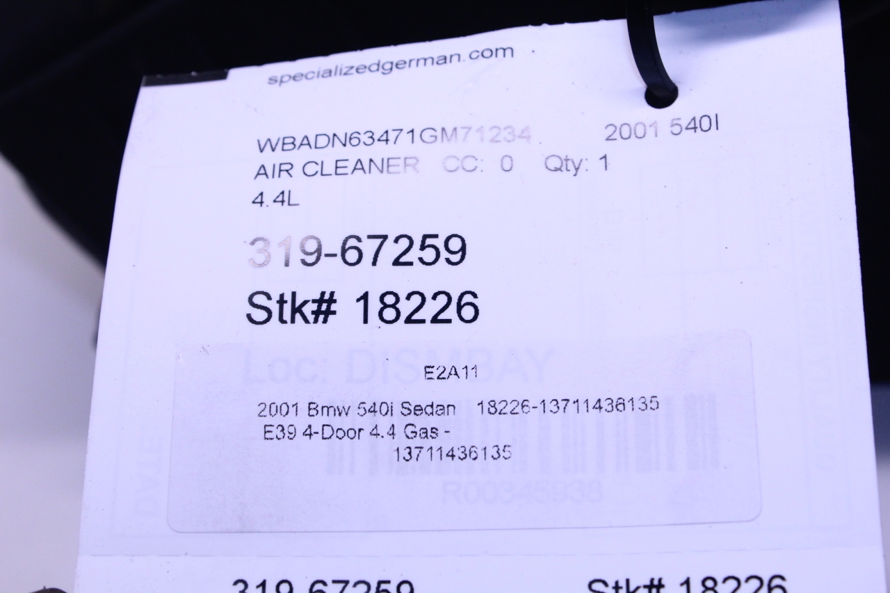 Specialized German is proud to offer this genuine used OEM 2001 BMW Air Filter Housing with OEM part number 13711436135. Other possible part numbers include 1436135. Please verify compatibility with your VIN or consult your technician before purchase.