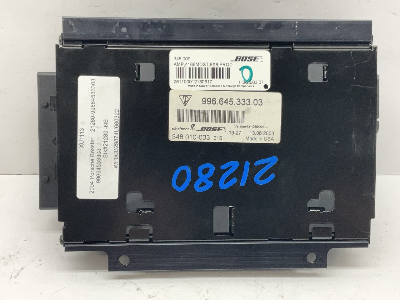 Specialized German is proud to offer this genuine used OEM 2004 Porsche Amplifier with OEM part number 99664533303. Other possible part numbers include 99664533301; 99664533302; 99664533303; 99664533304. Please verify compatibility with your VIN or consult your technician before purchase.