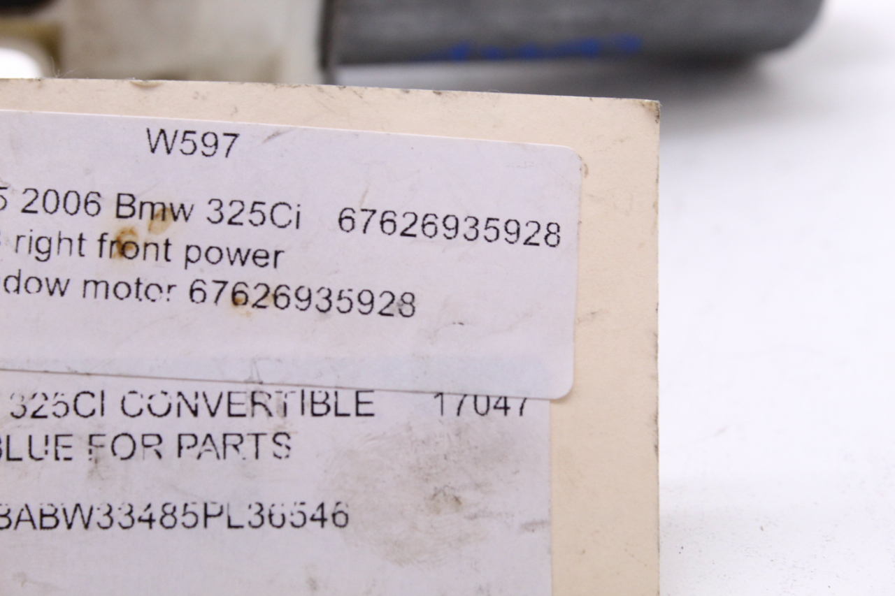 Specialized German is proud to offer this genuine used OEM 2005 BMW Power Window Motor with OEM part number 67626935928. Other possible part numbers include 6935928. Please verify compatibility with your VIN or consult your technician before purchase.