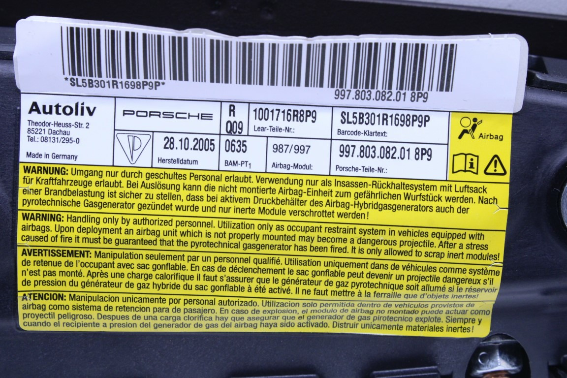 Specialized German is proud to offer this genuine used OEM 2006 Porsche Airbag with OEM part number 99780308201.