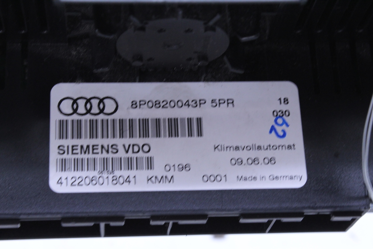 Specialized German is proud to offer this genuine used OEM 2007 Audi Temperature Control Panel with OEM part number 8P0820043P. Other possible part numbers include 8P0820043P; 8P0820043M. Please verify compatibility with your VIN or consult your technician before purchase.