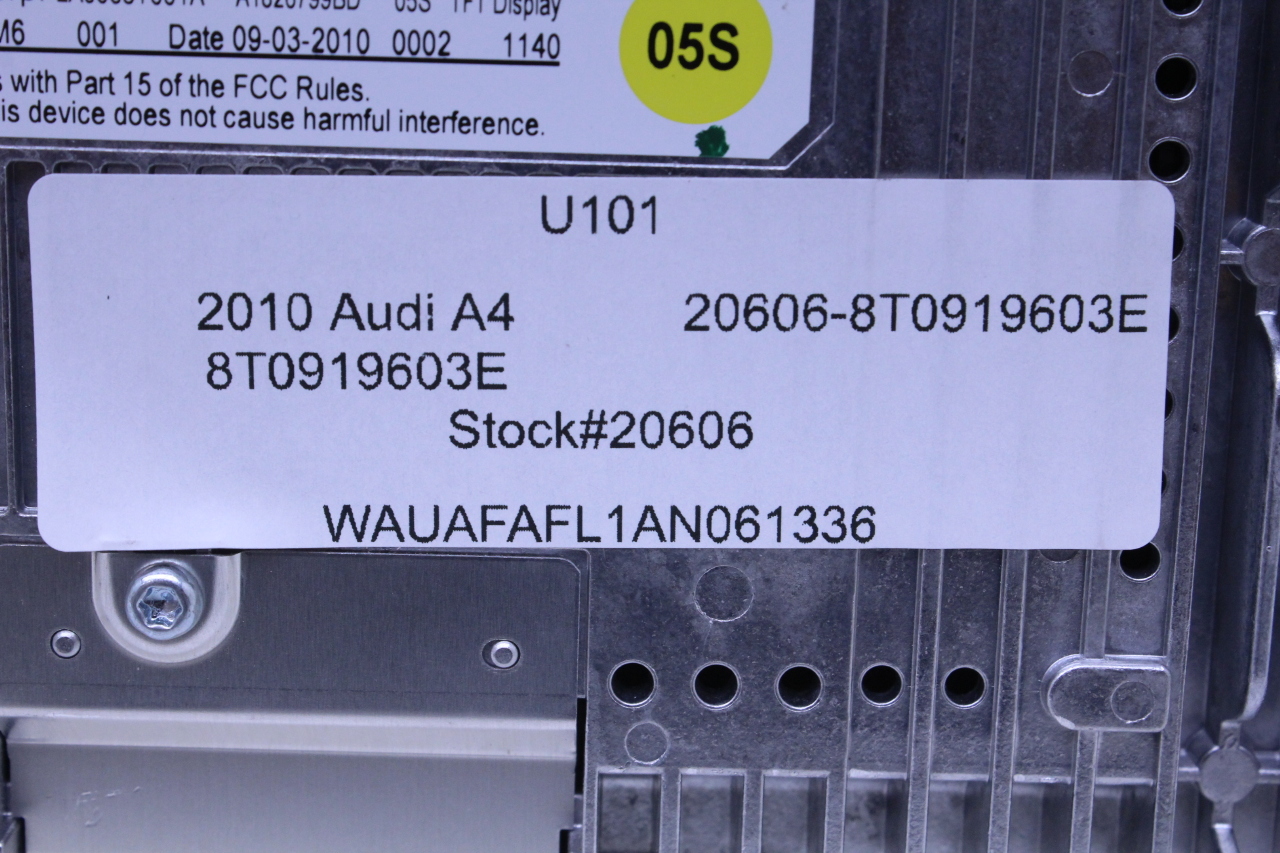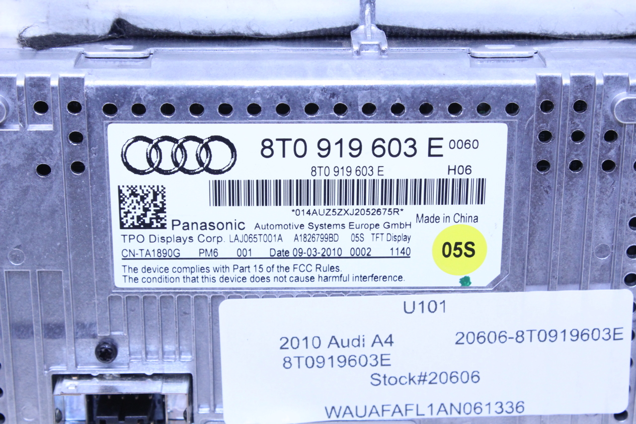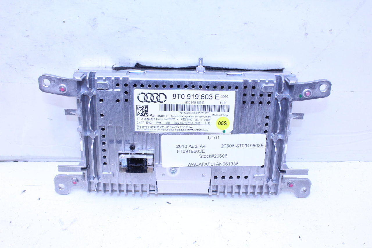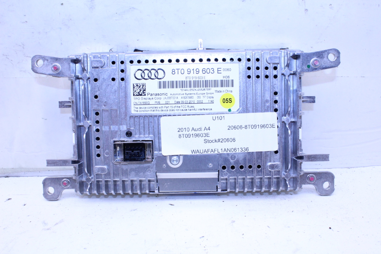 Specialized German is proud to offer this genuine used OEM 2010 Audi Display Monitor Screen with OEM part number 8T0919603E. Other possible part numbers include 8T0919603A; 8T0919603E; 8T0057603F; 8T0919603G. Please verify compatibility with your VIN or consult your technician before purchase.