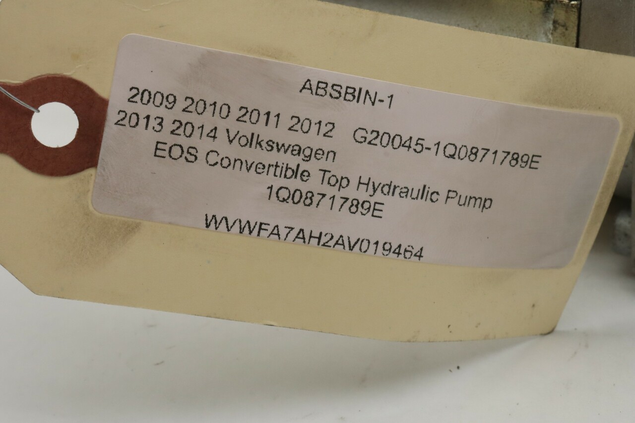 Specialized German is proud to offer this genuine used OEM 2010 Volkswagen Convertible Top Hydraulic Pump with OEM part number 1Q0871789E. Other possible part numbers include 1Q0871789C; 1Q0871789E; 1Q0871791B. Please verify compatibility with your VIN or consult your technician before purchase.