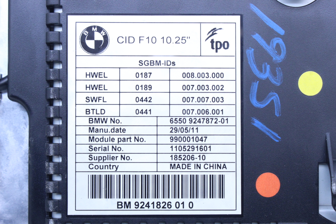 Specialized German is proud to offer this genuine used OEM 2011 BMW Display Monitor Screen with OEM part number 65509247872. Other possible part numbers include 9247872; 65509247872; 65509289008. Please verify compatibility with your VIN or consult your technician before purchase.