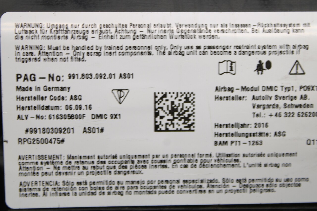 Specialized German is proud to offer this genuine used OEM 2017 Porsche Airbag with OEM part number 99180309201. Other possible part numbers include 99180309200; 99180309201; 99180309202; 99180309204. Please verify compatibility with your VIN or consult your technician before purchase.