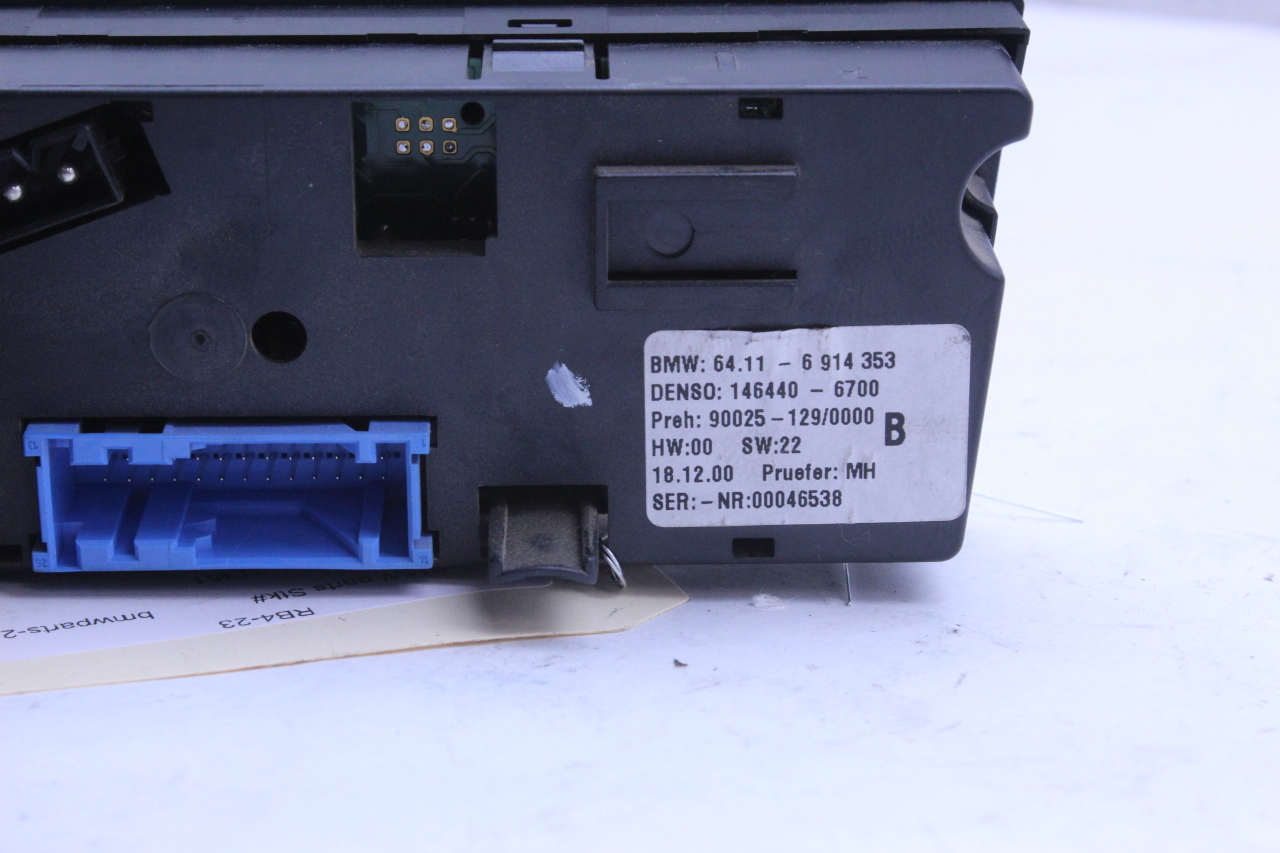 Specialized German is proud to offer this genuine used OEM 2001 BMW Temperature Control Panel with OEM part number 64116914353. Other possible part numbers include 6914353; 64116914353; 64116956319. Please verify compatibility with your VIN or consult your technician before purchase.
