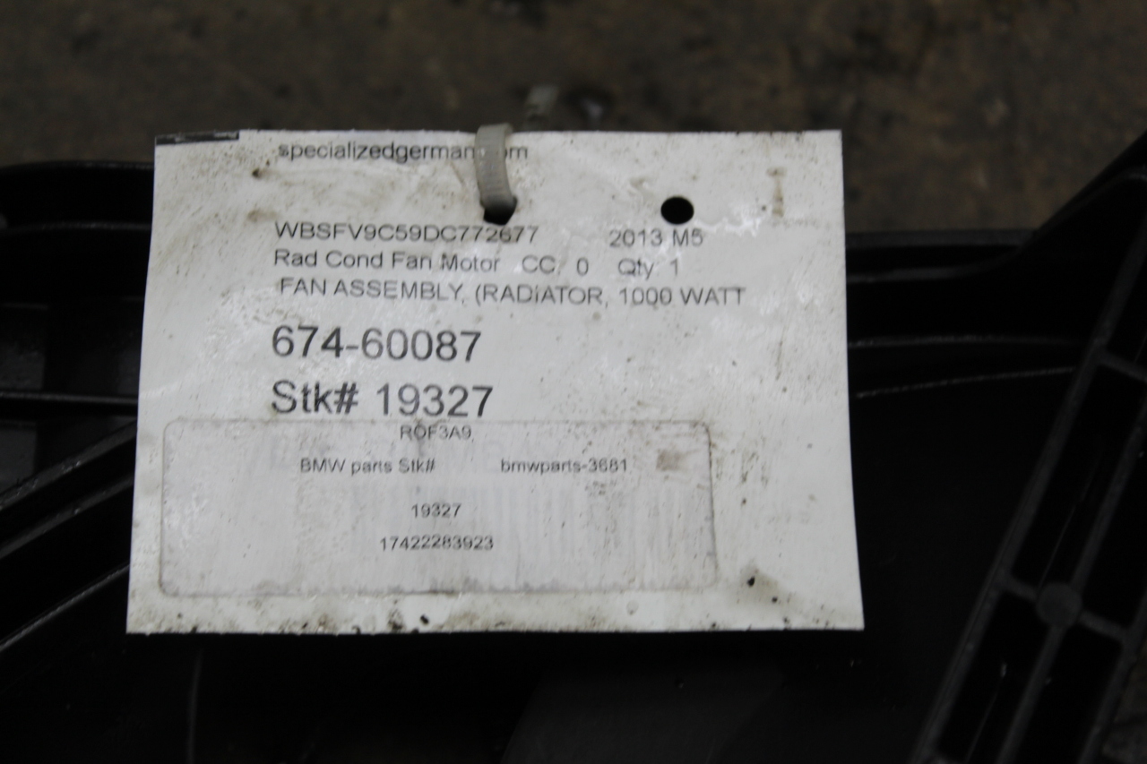 Specialized German is proud to offer this genuine used OEM 2013 BMW Radiator Fan with OEM part number 17422283923. Other possible part numbers include 2283923; 17422283923; 7602181; 67327602181. Please verify compatibility with your VIN or consult your technician before purchase.