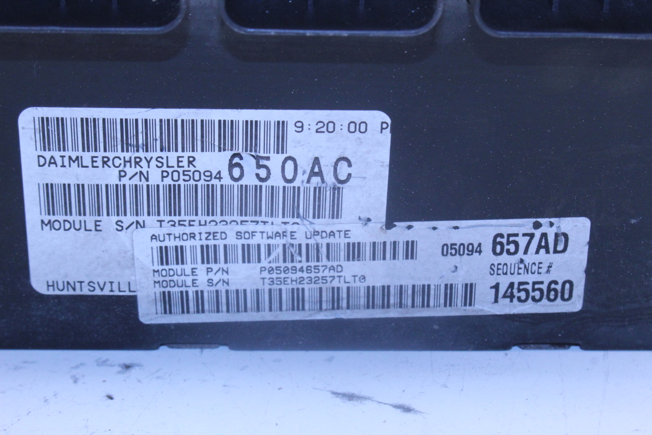Specialized German is proud to offer this genuine used OEM 2006 Chrysler Engine Computer Module with OEM part number P05094650AC. Other possible part numbers include P05094650AC. Please verify compatibility with your VIN or consult your technician before purchase.